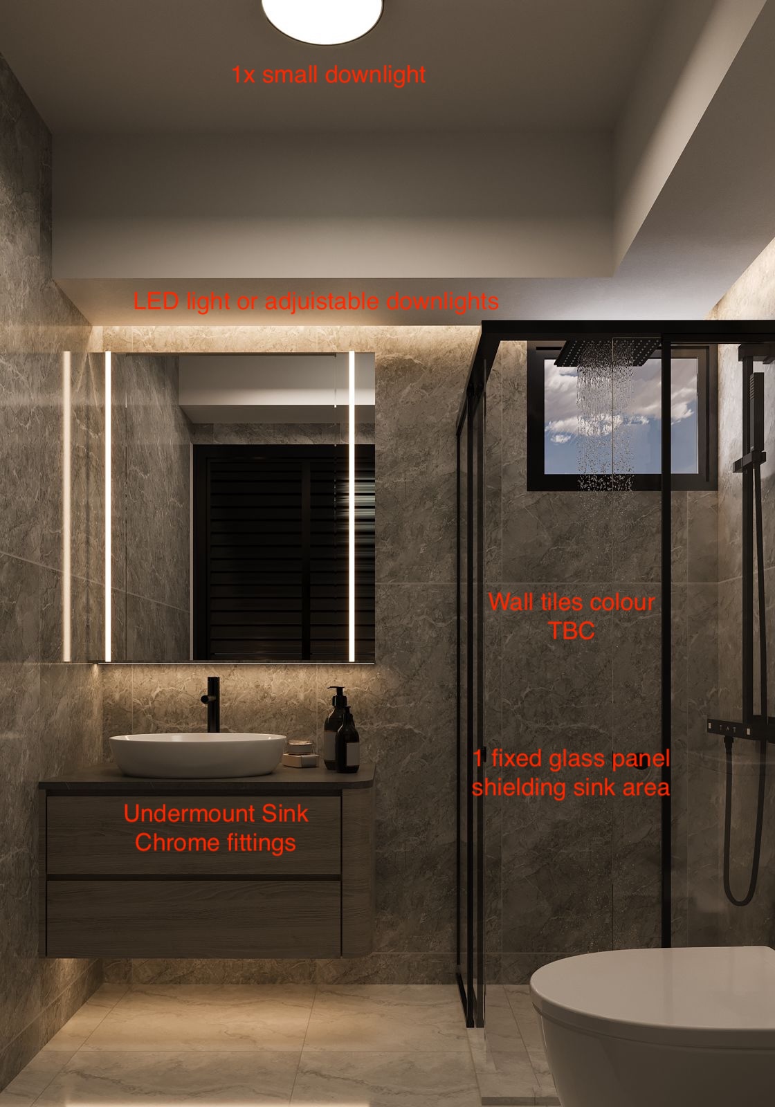 Have strip lights or spotlight type downlights on toilet panel box? Strip lights at shower niche