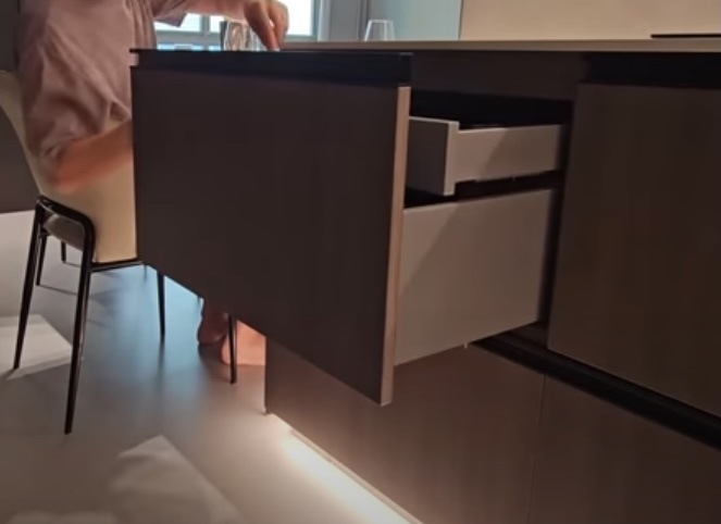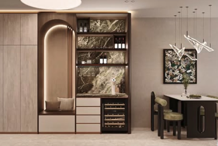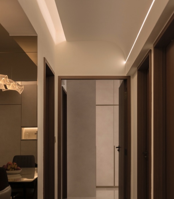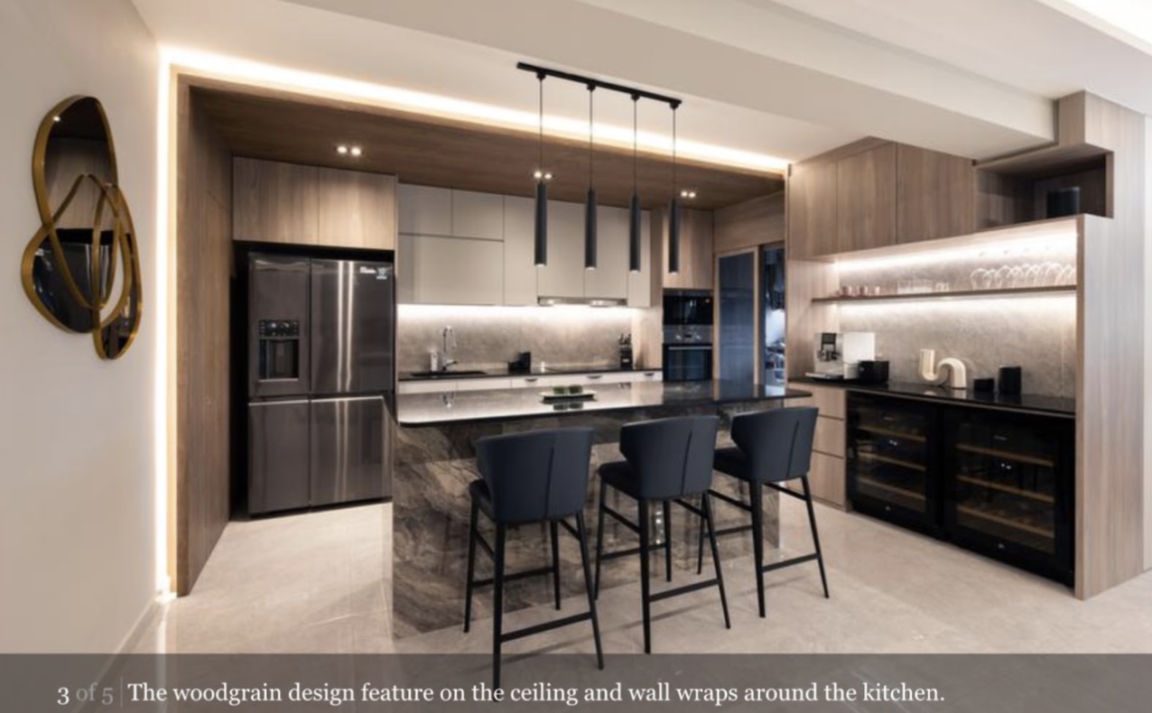 Has the modern luxe feel, like the panelling on the walls/ceilings with the downlights. However too much wood area makes overall colour a bit too dark