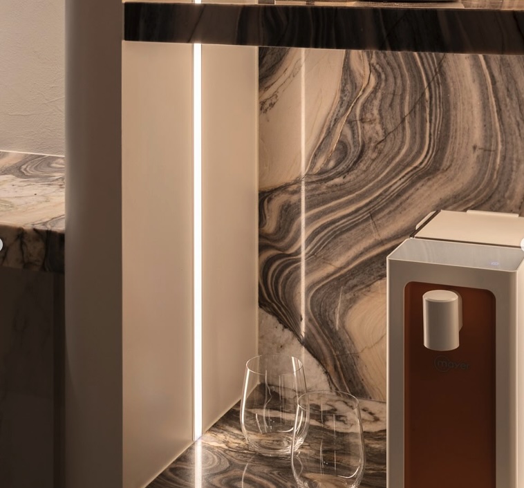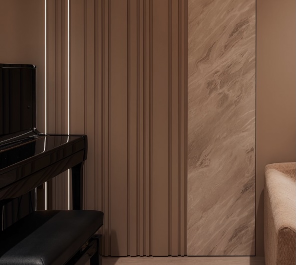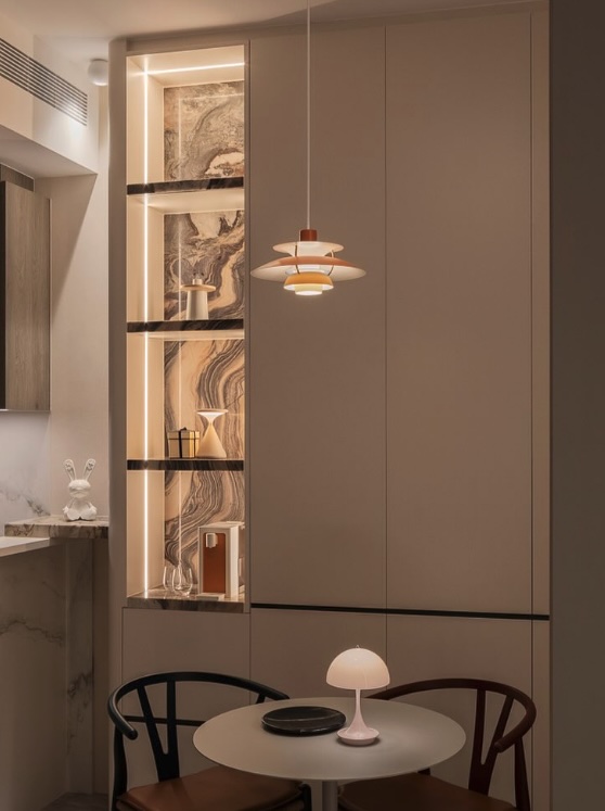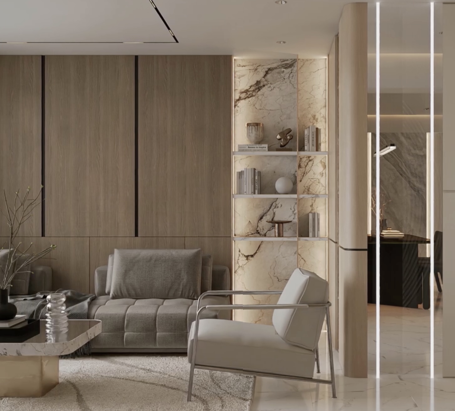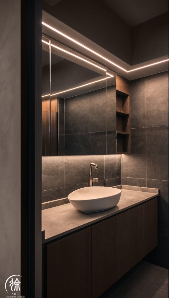Use of mirrors/marble textures. Black design details adds contrast, no plain walls. A good balance of quiet vs too opulent luxury. Like this tone of wood and also the vertical strip lights in carpentry
