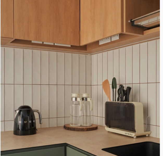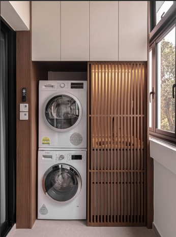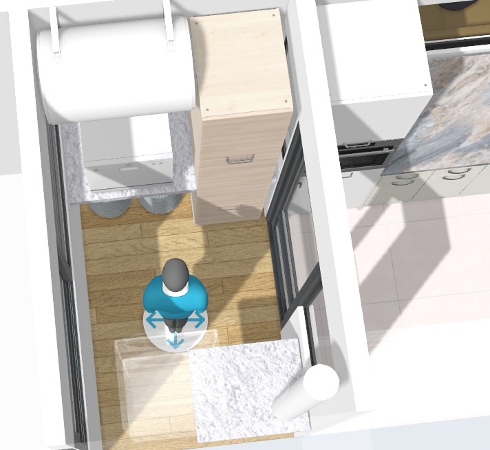 Layout idea for service yard.Full height cabinet with space for Dyson Vacuum, ikea trolley. Unsure can incorporate dustbin pull-out inside also? Below left fluted panel for laundry baskets. Countertop dishwasher placed on top (WxDxH 550x500x590)